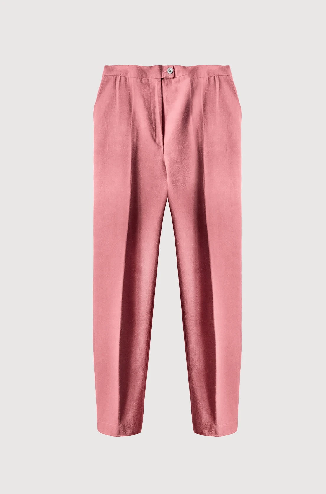 Lniane spodnie to podstawa w letniej garderobie. Dostępne są w dwóch modnych kolorach: antycznego różu i miętowym. Spodnie mają luźny fason i długość 7/8, więc sięgają nieco powyżej kostek. Skład materiału to 55% len i 45% wiskozy, przez co są wygodne, przewiewne i nosi się je komfortowo nawet przy wyższych temperaturach. Dzięki domieszce wiskozy spodnie są łatwe w prasowaniu i mniej się gniotą, co pozwala utrzymać schludny wygląd przez cały dzień.