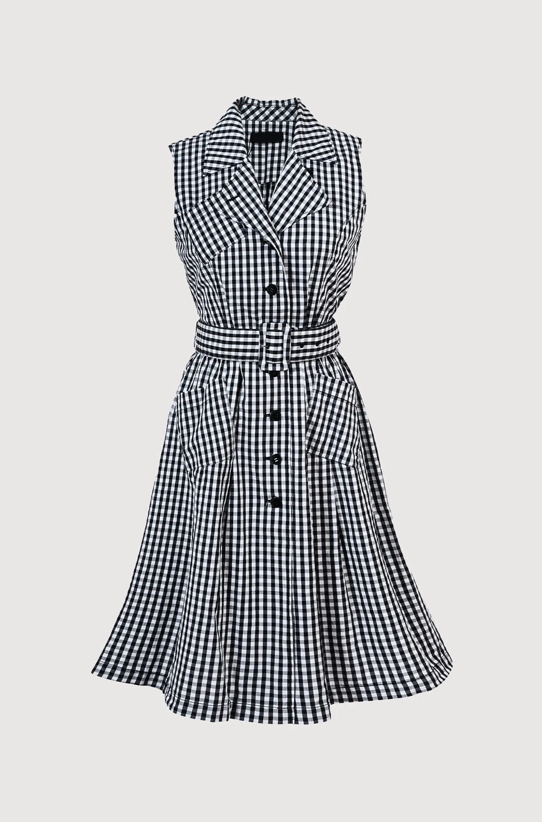 Vicenza to letnia sukienka w drobną biało-czarną kratkę. Rozkloszowany fason sukienki to klasyka lat 60, a kołnierz koszulowy i guziki dodają jej elegancji. Przewiązany pasek podkreśla talię, nadając sukience kobiecej sylwetki. To także praktyczny element, który dodaje charakteru całej stylizacji.